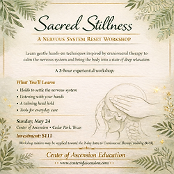 In this experiential 3-hour workshop, you’ll learn simple hands-on techniques that help calm the nervous system and bring the body into a state of relaxation and balance. These gentle practices are inspired by craniosacral therapy and can be used on yourself or with partners, friends, or family members. Together we’ll explore how slowing down, listening through the hands, and supporting the body with gentle touch can help shift the nervous system out of stress and into a deeper state of ease. Participants will leave with several practical techniques that can be used in everyday life to support relaxation, emotional balance, and nervous system health. No experience needed — just bring your hands and curiosity. In This Workshop You’ll Learn • A simple hold that helps the nervous system settle into deep relaxation • How to “listen” to the body through gentle touch • A calming hold on the head that supports emotional regulation • Practical tools you can use with partners, family, or friends Sunday, May 24 from 1-4pm at a private residence in Cedar Park, TX Investment: $111 Workshop tuition may be applied toward the 2-day Intro to Craniosacral Therapy training ($555) offered through Center of Ascension.